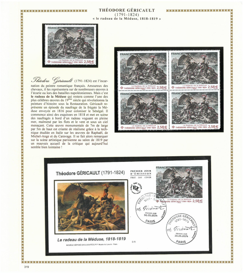 Vous pourrez placer sous présentation Hawid à fond noir, le timbre seul, son bloc de 4 et l’enveloppe premier jour illustrée qui vous indique sa date et son lieu de mise en vente.