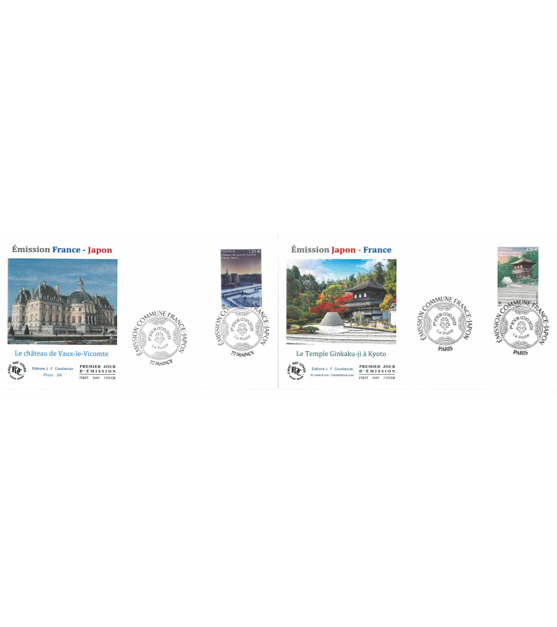 2 enveloppes avec les timbres château de Vaux-le-Vicomte et temple Ginkaku-ji, oblit PJ 77 Maincy et Paris 7/10/2025