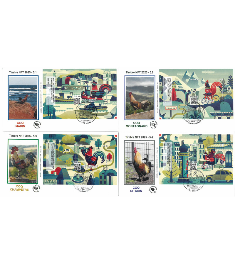 4 enveloppes soie avec les blocs NFT 5.1 COQ MARIN / 5.2 COQ MONTAGNARD / 5.3 COQ CHAMPETRE / 5.4 COQ CITADIN, oblit PJ Paris 16/9/2025